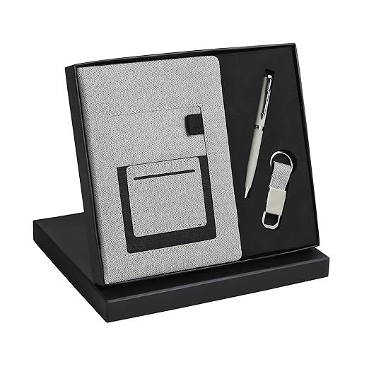 An elegant and practical corporate gift set featuring a premium diary, smooth-writing pen, and stylish keychain—ideal for executive gifting, onboarding kits, and client appreciation.